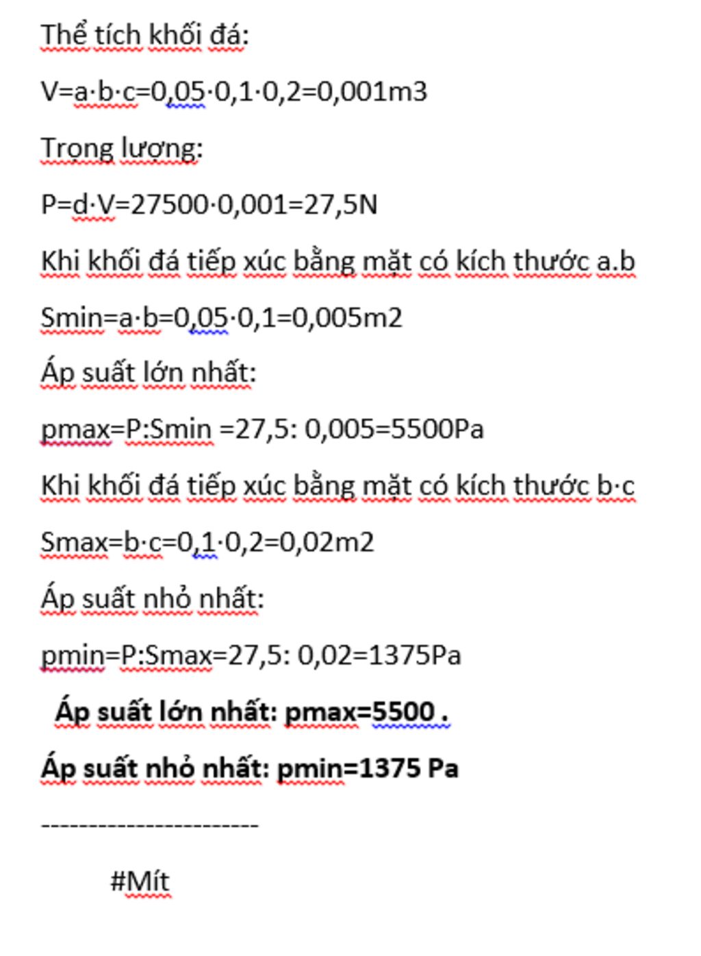 Một khối đá hoa cương dạng hình hộp chữ nhật có kích thước a=5cm,b=10cm, c=20cm . Đặt khối đá trên bàn nằm ngang. Biết trọng lượng riêng của đá hoa cương là d = 27500 N/m3. Tính áp suất lớn nhất và nhỏ nhất khối đá tác dụng lên mặt bàn?