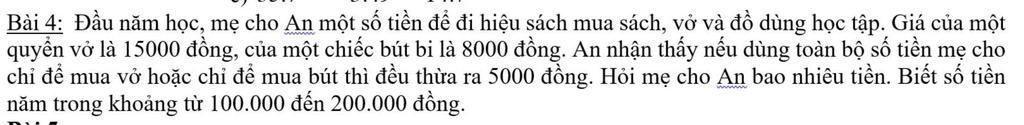 `-` Gọi số tiền An được mẹ cho là `x` ( nghìn đồng ) `(x gt 0;100 le x le 200)`
