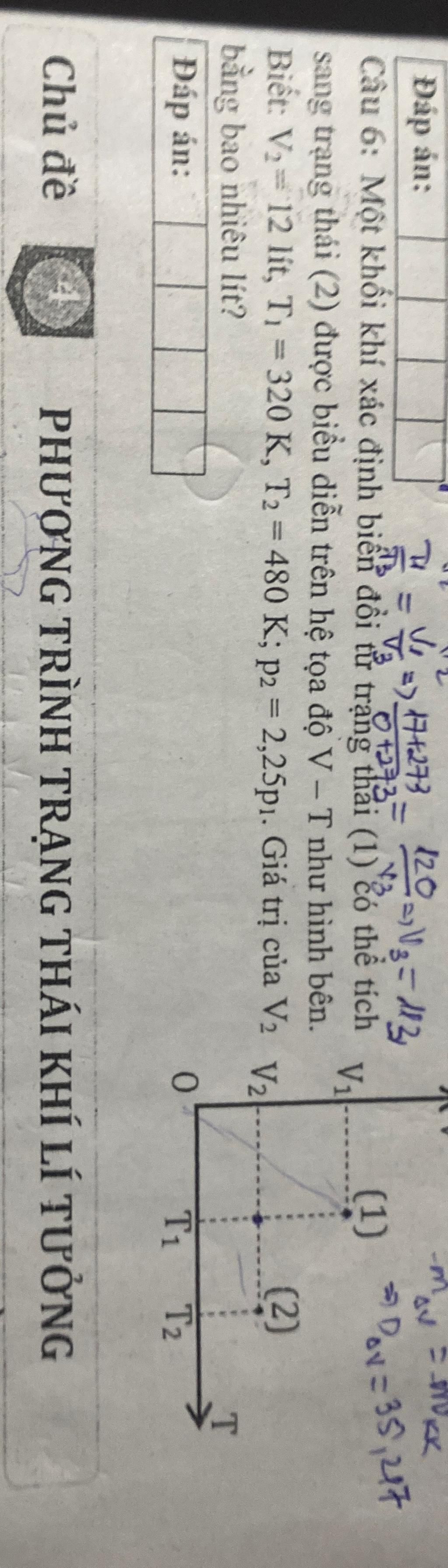 Vì cả 3 yếu tố đều thay đổi ta áp dụng phương trình trạng thái khí lý tưởng: $$ \frac{P_{1}.V_{1}}{T_{1}}= \frac{P_{2}.V_{2}}{T_{2}}$$ $$ \frac{P_{1}.12}{320}= \frac{2.25P_{1}.V_{2}}{480}$$ $$ \frac{1.12}{320}= \frac{2.25.V_{2}}{480}$$ $$ => V_{2} = 8 lít$$