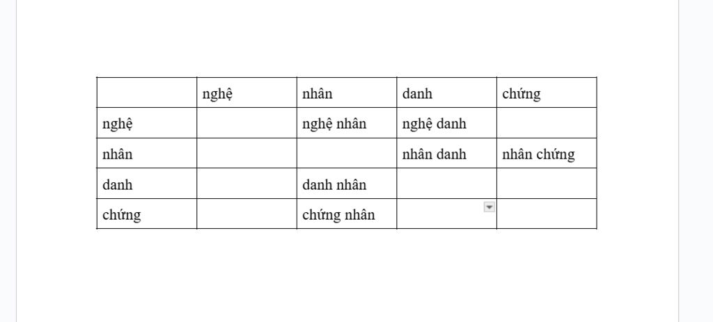- Từ các tiếng " nghệ , danh , nhân , chứng " có thể ghép được 6 từ đó là :