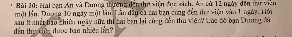 Vậy trong ` 60 ` ngày, ` 2 ` bạn đó sẽ gặp nhau tại thư viện và khi đó Dương đã đến thư viện ` 6 ` lần