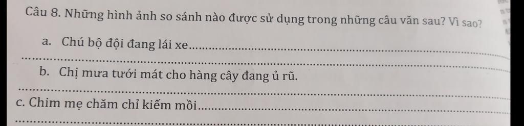- Câu này không có hình ảnh so sánh rõ ràng, nhưng nếu được phát triển tiếp (ví dụ: “như một cơn gió lao nhanh qua cánh đồng”), thì ta mới thấy phép so sánh. Nếu chỉ dừng ở đây, câu miêu tả hành động của chú bộ đội một cách trực tiếp, không mang hình ảnh ẩn dụ hoặc so sánh.