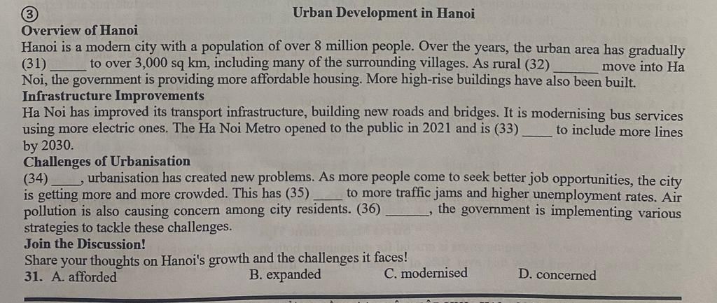Hà Nội là một thành phố hiện đại với dân số hơn 8 triệu người. Qua nhiều năm, khu vực đô thị đã dần dần (31) mở rộng đến hơn 3.000 km², bao gồm nhiều làng mạc xung quanh. Khi (32) dân cư nông thôn chuyển đến Hà Nội, chính phủ đang cung cấp nhiều nhà ở giá rẻ hơn. Nhiều tòa nhà cao tầng cũng đã được xây dựng.