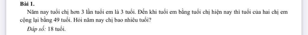 Năm nay tuổi chị hơn 3 lần tuổi em là 3 tuổi. Đến khi tuổi em bằng tuổi chị hiện nay thì tuổi của hai chị em