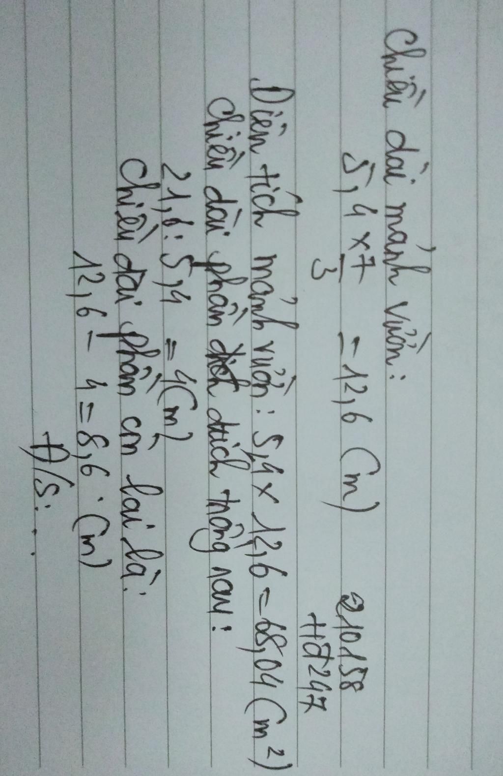 Mảnh vườn của nhà bác Thắng dạng hình chữ nhật có chiều rộng 5,4 m chiều dài bằng bẩy phần ba chiều rộng bác Thắng cá sử dụng 21,6 m² dọc theo chiều rộng như hình vé để trồng rau, chiều dài phần đất còn lại là bao nhiêu m