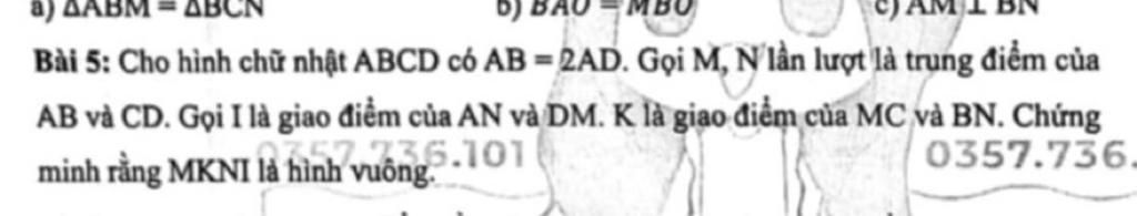 cho hình chữ nhật ABCD có AB = 2AD. Gọi M, N lần lượt là trung điểm của AB và CD. Gọi I là giao điểm của AN mà DM. Gọi K là giao điểm của MC và BN. Chứng minh rằng MKNI là hình vuông