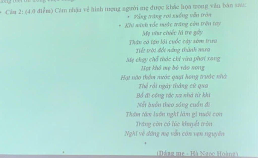 Có những điều trong cuộc đời, càng lớn lên con người ta lại càng thấm thía, càng khắc cốt ghi tâm. Một trong số đó chính là tình mẫu tử - dòng chảy âm thầm mà bền bỉ, nuôi dưỡng tâm hồn ta từ những năm tháng đầu đời đến suốt cả cuộc sống. Người mẹ - không cần những điều vĩ đại chỉ bằng sự tảo tần, nhẫn nại và tình yêu bao la cũng đủ khiến ta xúc động và biết ơn. Trong dòng chảy thi ca Việt Nam, đã có biết bao hình tượng người mẹ hiện lên với nét đẹp dung dị mà sâu sắc. Một trong những hình ảnh đáng nhớ ấy là hình tượng người mẹ trong đoạn thơ “Dáng mẹ” của Hà Ngọc Hoàng nơi người đọc cảm nhận rõ dáng hình gầy guộc, lam lũ, nhưng lại tỏa sáng bằng tình yêu thương và đức hy sinh thầm lặng.