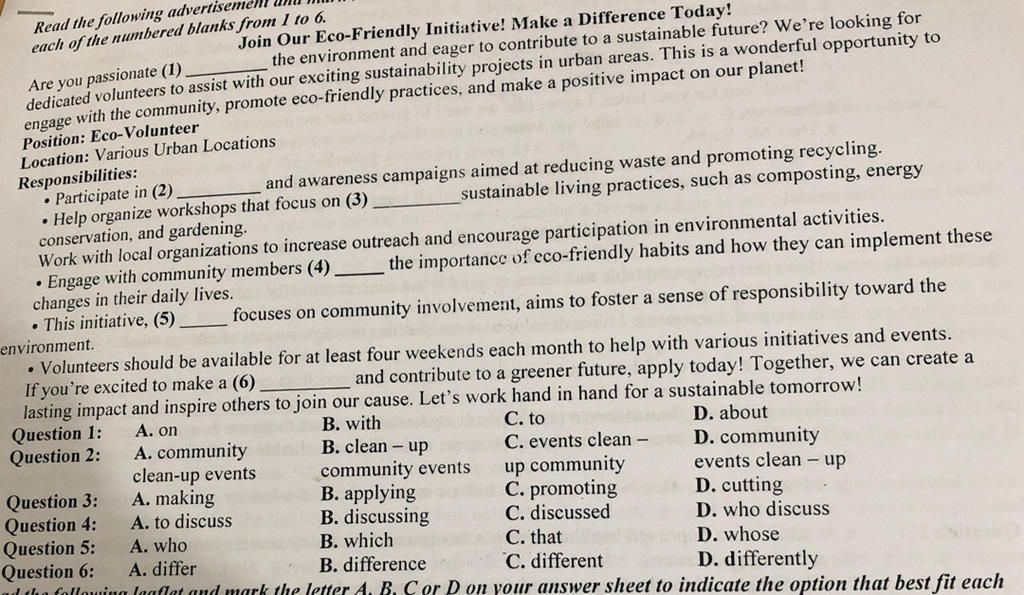each of the numbered blanks from 1 to 6.