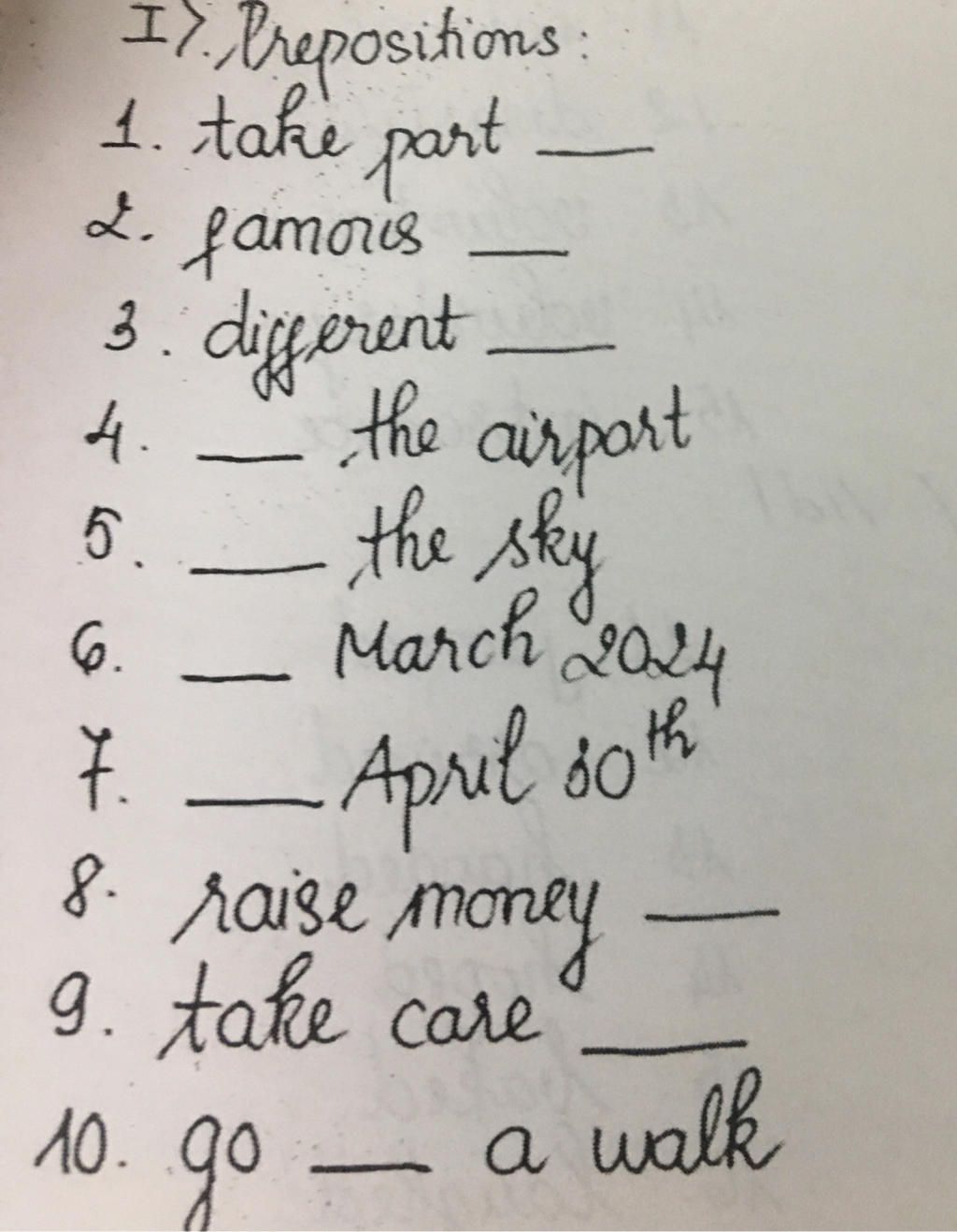 10 for (Ta có cụm từ: go for a walk (phr v): Đi dạo).