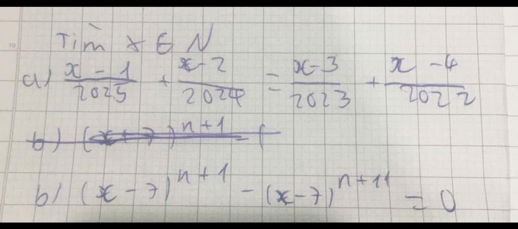 `b) (x - 7 )^( n + 1 ) - ( x - 7 )^( n + 11 ) = 0`