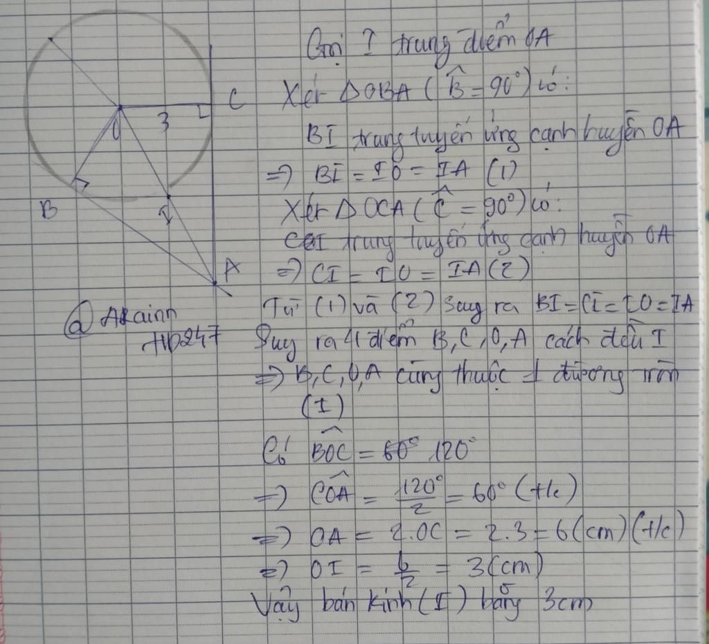Vậy bán kính đường tròn ngoại tiếp tứ giác `ABOC` là `R = 3` `cm`.
