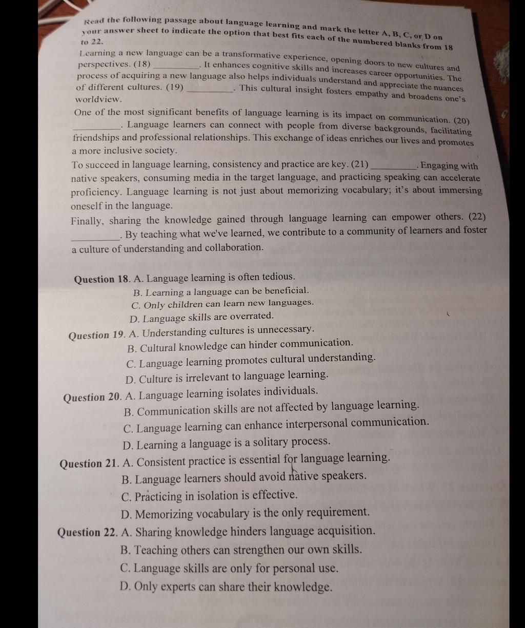 •Giải thích: Câu đầu nói rằng việc học ngôn ngữ mới có thể mở ra những cơ hội, cải thiện khả năng nhận thức, tăng cơ hội nghề nghiệp và hiểu biết văn hóa. Điều này nhấn mạnh lợi ích của việc học ngôn ngữ.