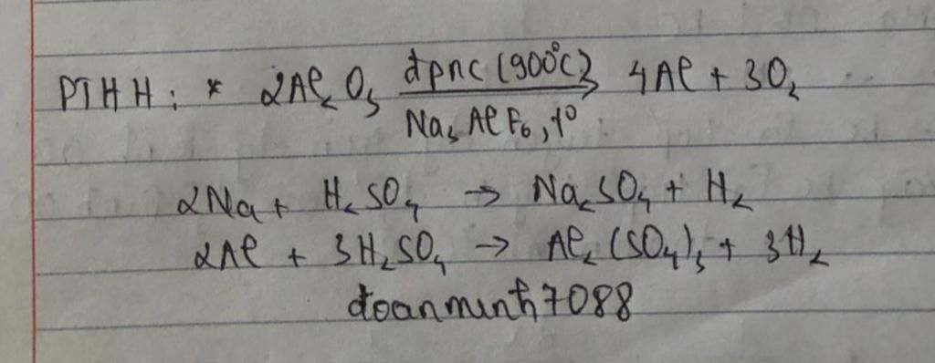 $\rm Al_2O_3 (có~tạp ~chất ) \xrightarrow[Na_3AlF_6]{đpnc} 2Al +\dfrac{3}{2} O_2$
