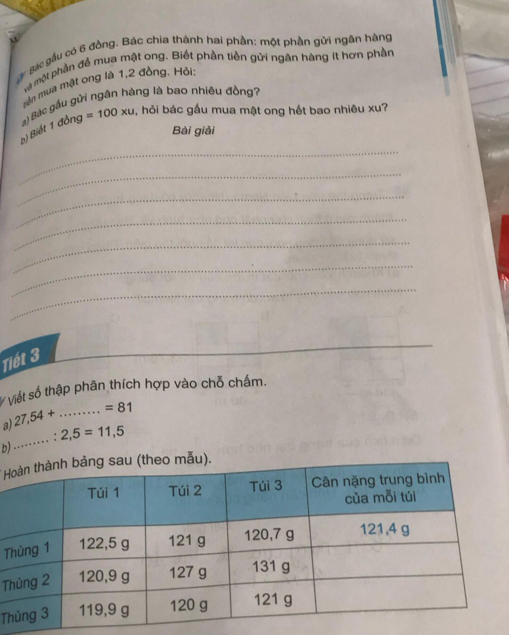 b)Số tiền bác gấu mua maajt ong là:(6+1,2):2=3,6(đồng)