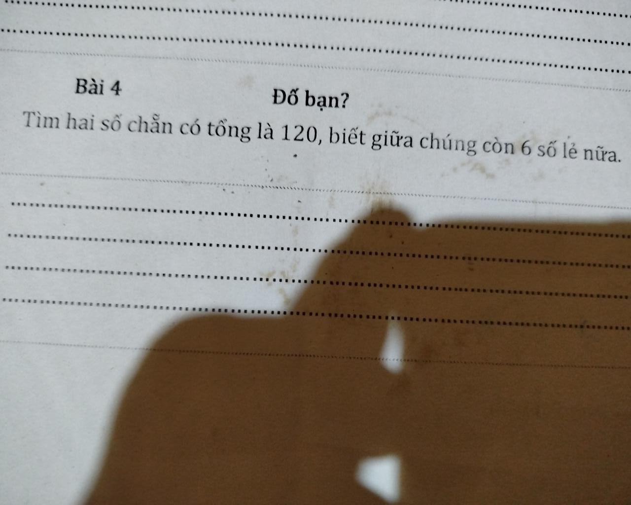 Tìm hai số chẵn có tổng là 120, biết giữa chúng còn 6 số lẽ nữa