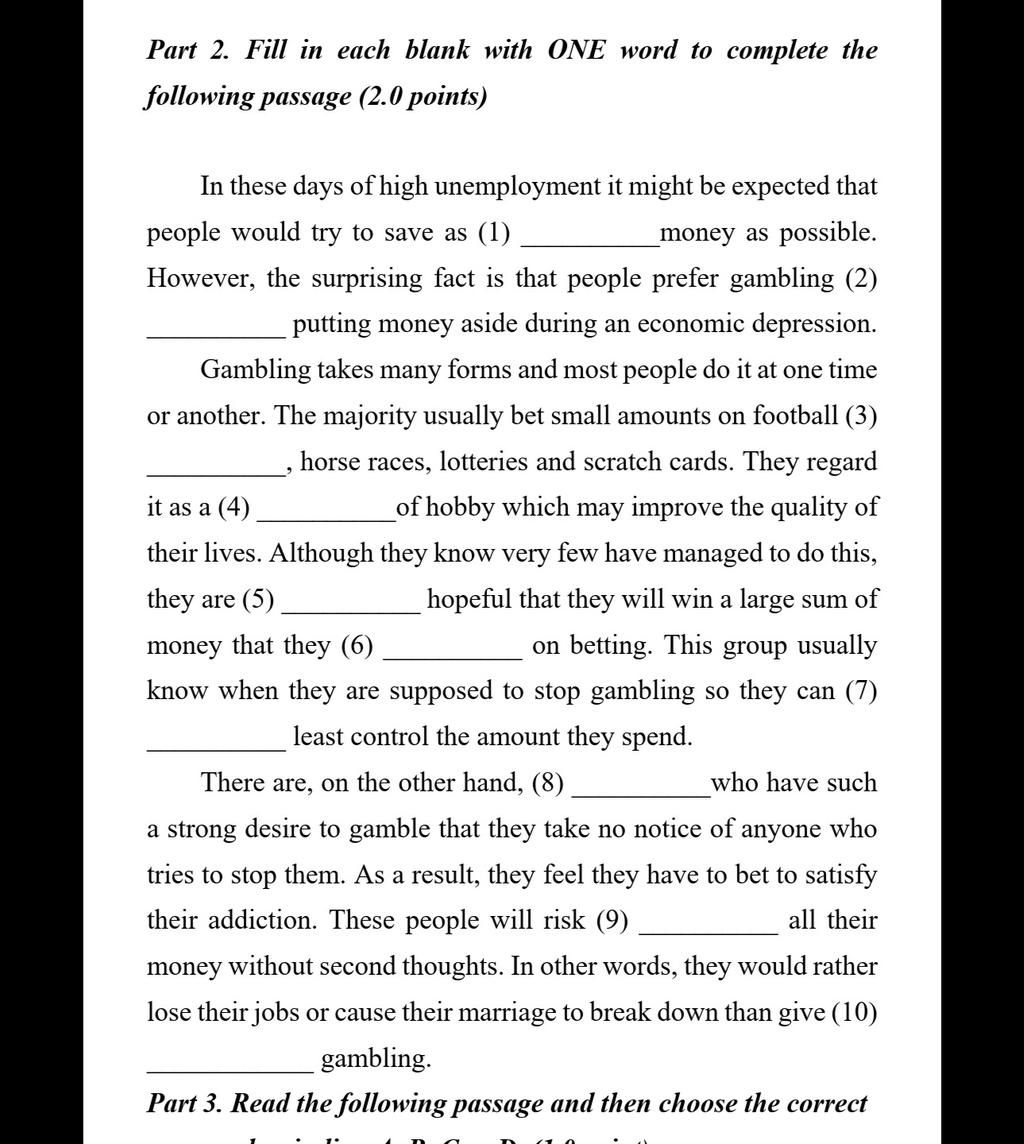 Part 2. Fill in each blank with ONE word to complete the