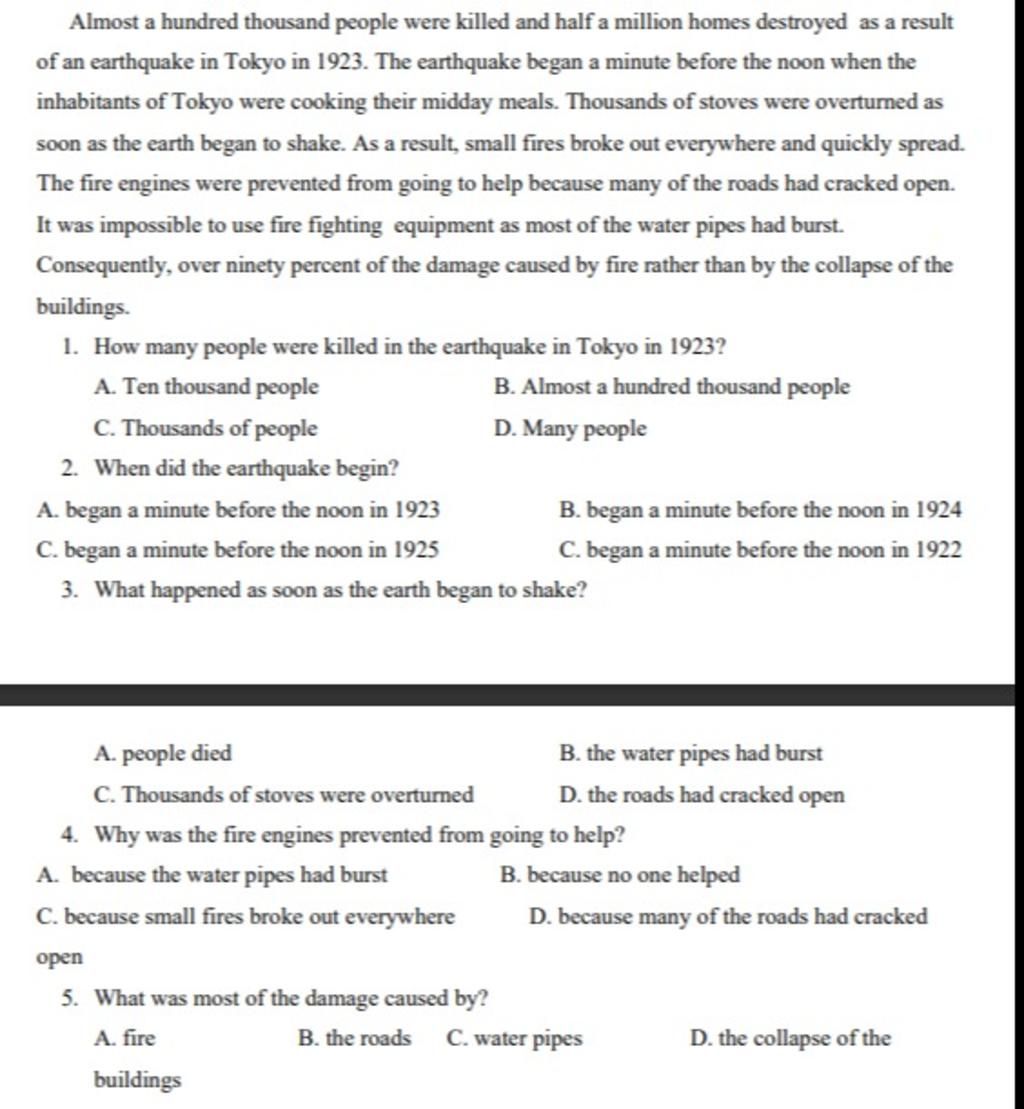 - Dẫn chứng: The fire engines were prevented from going to help because many of the roads had cracked open.