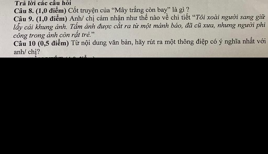Câu 9. (1,0 điểm) Anh/ chị cảm nhận như thế nào về chi tiết “Tôi xoài người sang giữ lấy cái khung ảnh. Tấm ảnh được cắt ra từ một mảnh báo, đã cũ xưa, nhưng người phi công trong ảnh còn rất trẻ.”