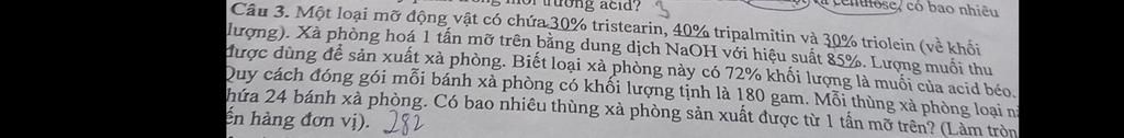 Câu 3. Một loại mỡ động vật có chứa 30% tristearin, 40% tripalmitin và 30% triolein (về khối