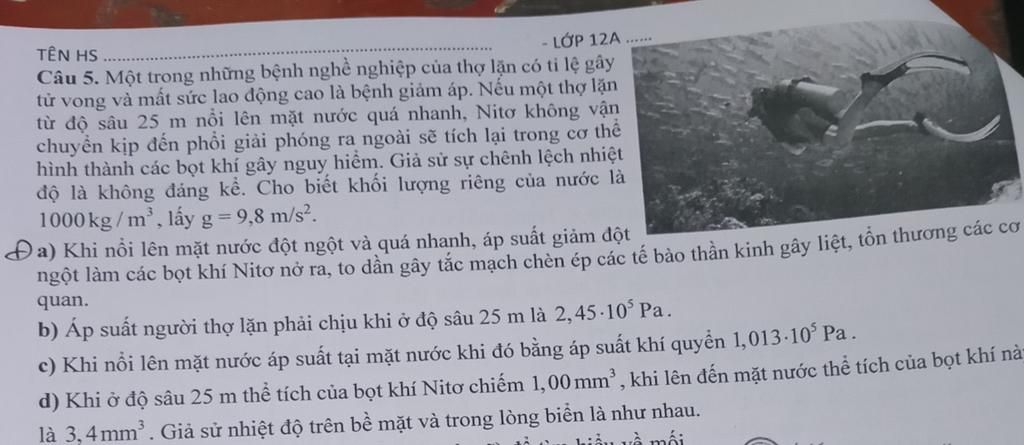 Áp suất người thợ lặn phải chịu ở độ sâu 25m là: