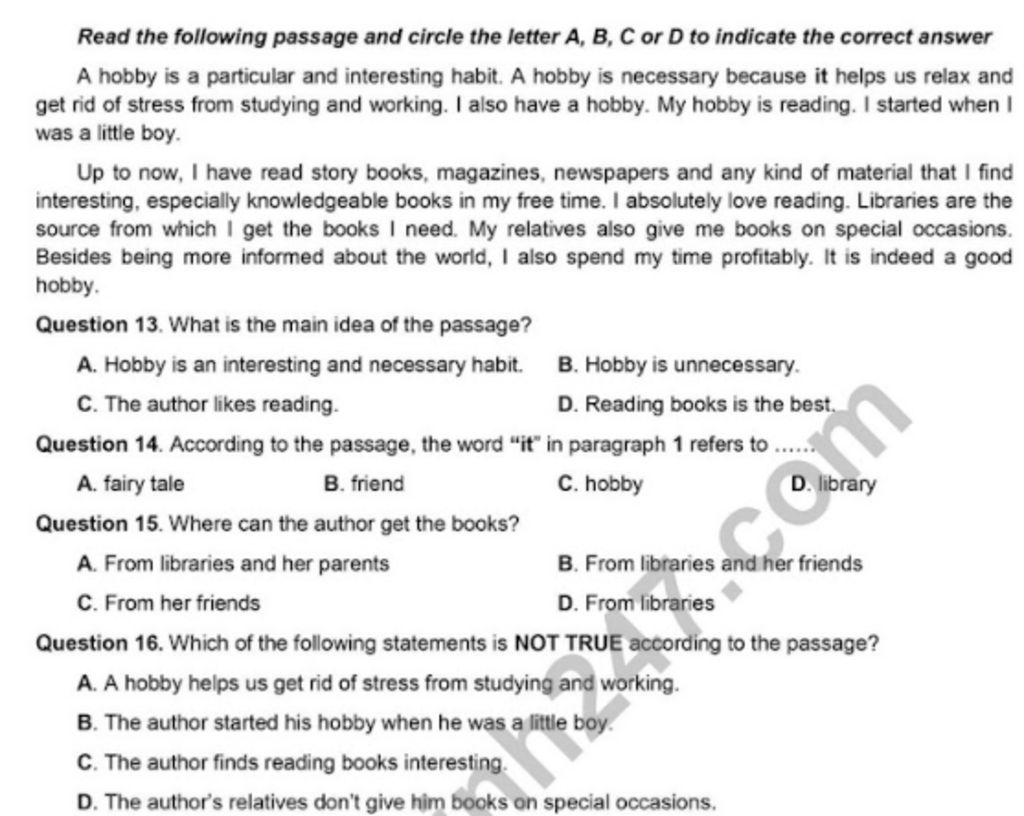 Câu 14 là C vì trong bài ghi 'A hobby is necessary because it helps us relax and get rid of stress from studying and working'