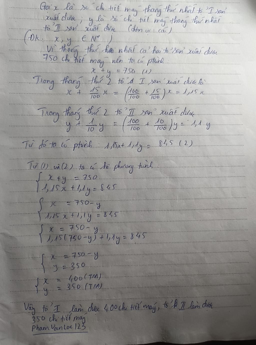 Trong tháng thứ nhất, hai tổ sản xuất được 750 chi tiết máy. So với tháng thứ nhất, trong tháng thứ hai, tổ một sản xuất vượt 15%, tổ hai sản xuất vượt 10% nên trong tháng này, cả hai tổ đã sản xuất được 845 chi tiết máy. Hỏi trong tháng thứ nhất mỗi tổ sản xuất được bao nhiêu chi tiết máy