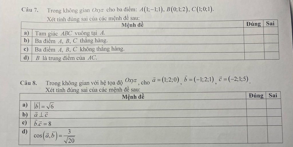 `=>` `vec(AB), vec(AC)` không cùng phương