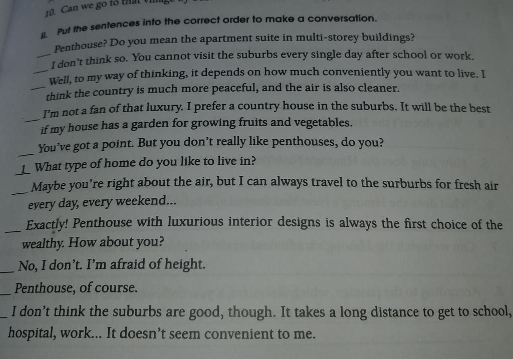 8. Tôi không nghĩ vùng ngoại ô là tốt, mặc dù. Mất thời gian dài để đến trường, bệnh viện, nơi làm việc... Nó không tiện cho tôi.