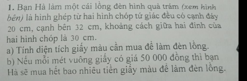1. Bạn Hà làm một cái lồng đèn hình quả trám (xem hình
