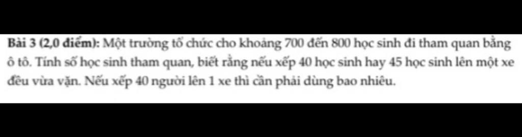 Khi xếp `40` học sinh hay `45` học sinh lên `1` xe đều vừa vặn