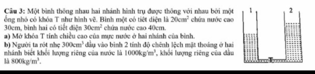 Sau khi mở khóa `T`, chiều cao của mực nước ở hai nhánh là `h (cm)`.