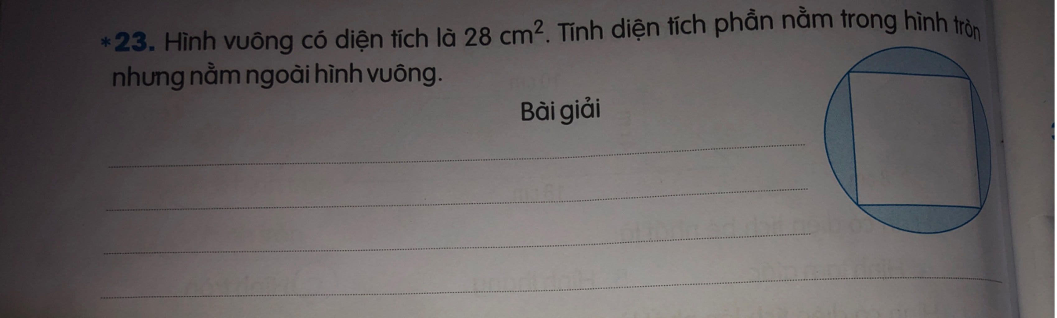 Hình vuông có diện tích là 28 cm2 tính diện tích phần nằm trong hình tròn