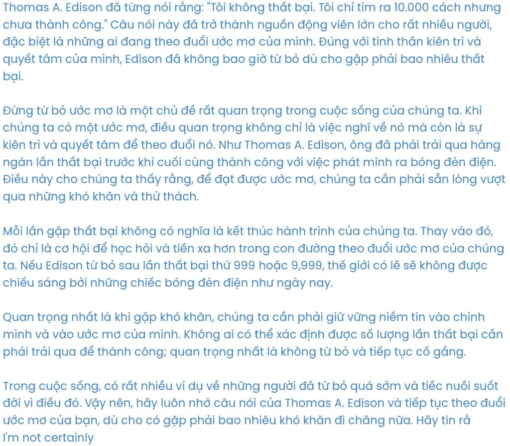 “Tôi không thất bại. Tôi chỉ tìm ra 10.000 cách nhưng chưa thành công”. Đó là câu nói nổi tiếng của nhà sáng chế thiên tài Thomas A Edison khi cuối cùng ông cũng phát minh ra bóng đèn điện sau 10.000 lần thất bại. Hãy thử tưởng tượng bạn có đủ kiên nhẫn để thử nghiệm 10.000 lần thất bại hay không? Quả thật, khi ta dám đặt ra những ước mơ và nỗ lực theo đuổi thì sẽ chinh phục được mong ước đó.