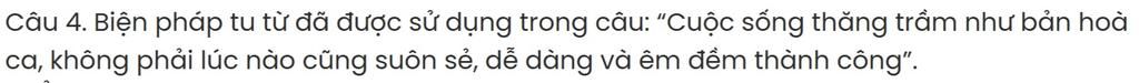 `+` Qua biện pháp tu từ , chúng ta như hiểu thêm được rằng cuộc sống không cho ai tất cả , cũng không lấy đi của ai tất cả mà mọi thứ đều sẽ có lúc phải thăng trầm , khó khăn hay êm dịu như những bản hòa ca .