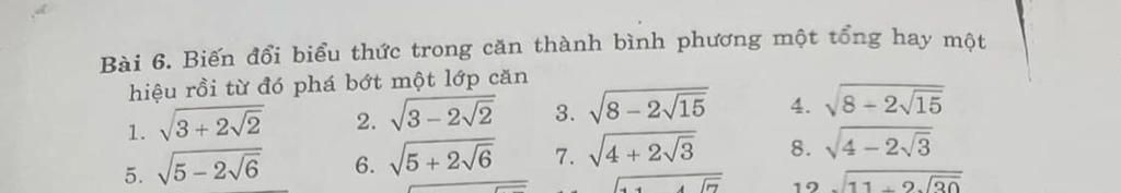 6)`\sqrt(5+2\sqrt6)=\sqrt(3+2\sqrt6+2)=\sqrt((\sqrt3+\sqrt2)^2)=|\sqrt3+\sqrt2|=\sqrt3+\sqrt2`