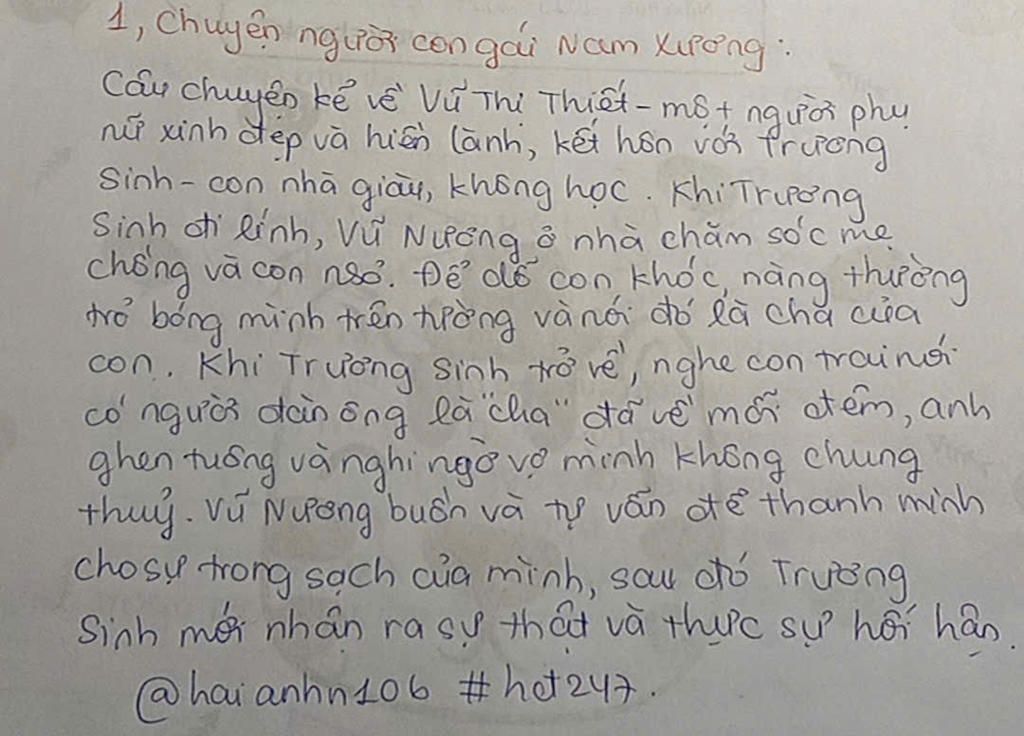 bn ơi làm lại văn bản cuối đi ạ tại cô mik ko cho làm vb cuối á vb Người con gai j đó vb đó mik học r ạ