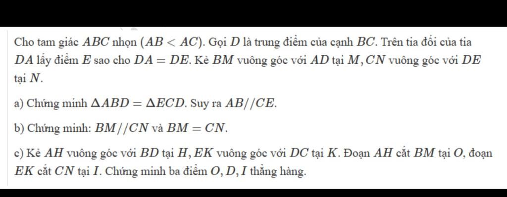 Cho tam giác ABC nhọn (AB < AC). Gọi D là trung điểm của cạnh BC. Trên tia đối của tia