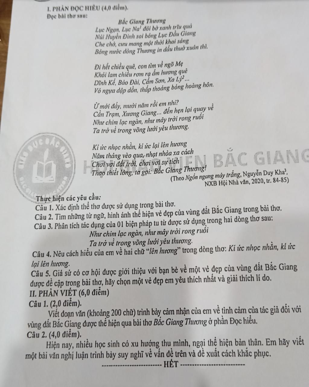Bài thơ Bắc Giang Thương của Nguyễn Duy Khá thể hiện tình cảm sâu nặng của tác giả đối với quê hương Bắc Giang. Xuyên suốt bài thơ, hình ảnh thiên nhiên và con người Bắc Giang hiện lên vừa tươi đẹp, vừa đậm chất lịch sử. Tác giả gợi nhắc về những địa danh quen thuộc như Lục Ngạn, Lục Nam, dòng sông Thương, núi Huyền Đinh—tất cả đều in đậm dấu ấn quê hương. Không chỉ ca ngợi vẻ đẹp tự nhiên, bài thơ còn chất chứa tình cảm nhớ thương, gắn bó của người con xa quê. Những câu thơ như "Như chim lạc ngàn, như mây trời rong ruổi / Ta trở về trong vòng lưới yêu thương" thể hiện khát khao trở về, sự gắn bó thiêng liêng với miền đất Bắc Giang. Hình ảnh "kí ức nhọc nhằn, kí ức lại lên hương" còn cho thấy tác giả trân trọng cả những kỉ niệm khó khăn nhưng đầy ý nghĩa. Qua đó, bài thơ không chỉ là lời tri ân quê hương mà còn khơi gợi niềm tự hào, tình yêu tha thiết dành cho Bắc Giang trong lòng mỗi người con xa xứ.
