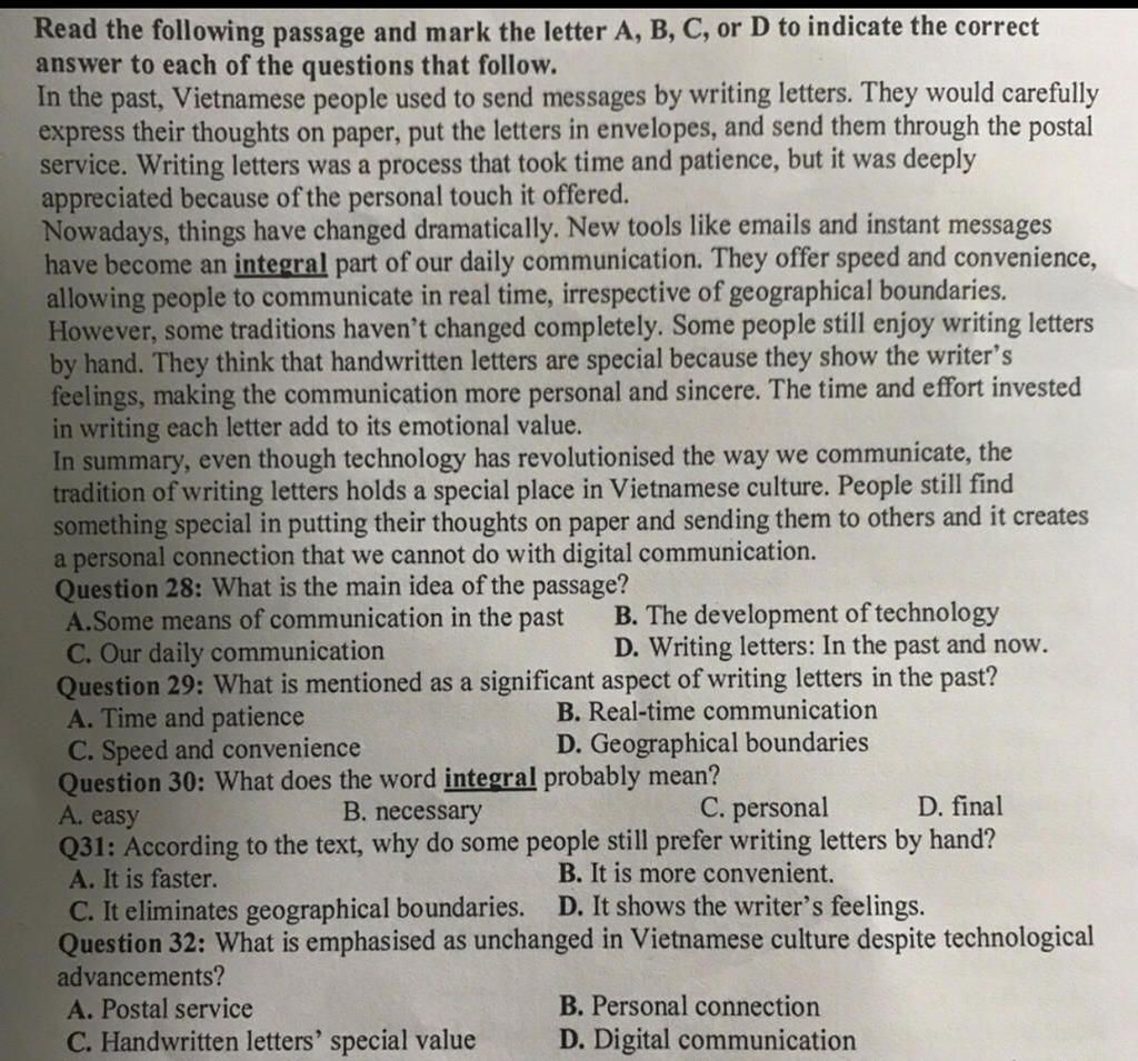 `-` Dẫn chứng: However, some traditions haven’t changed completely. Some people still enjoy writing letters by hand. They think that handwritten letters are special because they show the writer’s feelings, making the communication more personal and sincere.