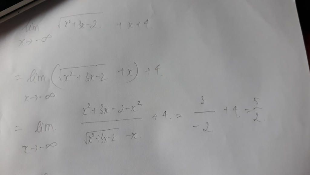 $\underset{x \to -\infty}{\lim} (\sqrt{x^2 + 3x - 2} + x + 4) = \dfrac{5}{2}$.