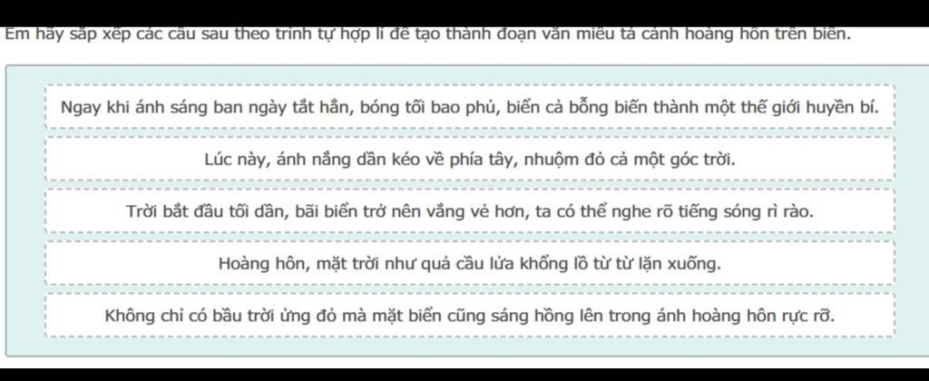 Sắp xếp theo trình tự hợp lí để tạo thành đoạn văn miêu tả cảnh hoàng hôn trên biển: