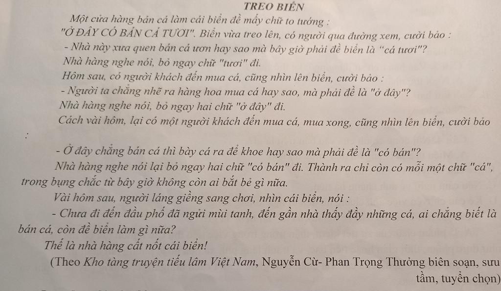 `-`Văn bản kể về quá trình người bán hàng treo biển hiệu và những thay đổi liên tục theo ý kiến của người qua đường.