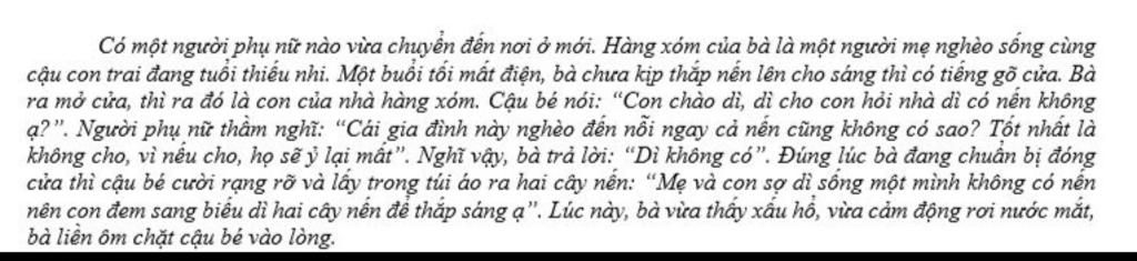 Cậu bé nghèo nhưng không ngại mang hai cây nến sang tặng người phụ nữ vừa chuyển đến, lo sợ họ sẽ gặp khó khăn trong đêm tối. Hành động nhỏ này thể hiện trái tim nhân hậu và sự quan tâm tinh tế của một đứa trẻ. Ngược lại, người phụ nữ ban đầu có ý nghĩ ích kỷ, chỉ nghĩ đến việc giữ cho mình. Nhưng trước sự chân thành của cậu bé, bà cảm thấy xấu hổ, rồi nhận ra ý nghĩa sâu sắc của sự sẻ chia.
