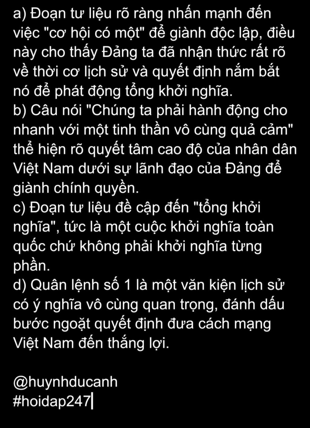 d) Đoạn tư liệu là văn kiện lịch sử quan trọng góp phần vào thắng lợi của Tổng khởi nghĩa tháng Tám năm
