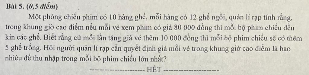 Vậy giá vé để lơi nhuận cao nhất là: `80 + 10 . 8 = 160` (nghìn đồng)