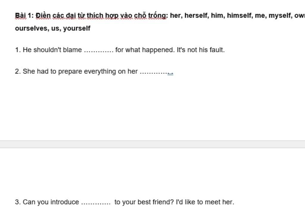 `-` Reflexive pronouns ( Đại từ phản thân ) : là đại từ dùng để phản chiếu lại chính chủ ngữ trong câu và thường dùng để thay thế cho một danh từ.