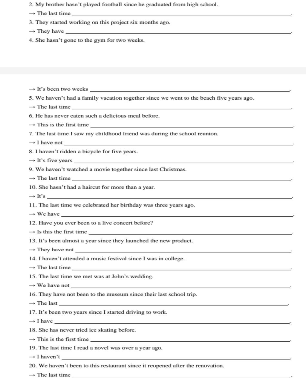4. It's been two weeks since she last went to the gym.