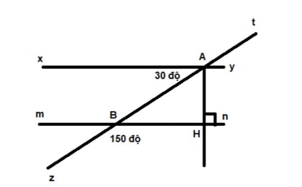 Cho hình vẽ bên, biết góc xAB = 30 độ, góc HBz = 150 độ, AH vuông góc với mn