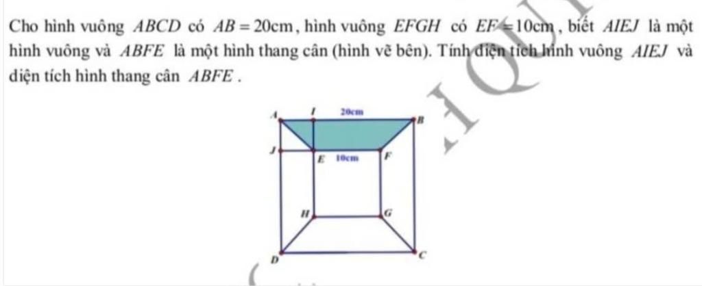Hình thang cân ABFE có đáy lớn AB = 20cm và đáy nhỏ EF = 10cm. Chiều cao bằng cạnh hình vuông AIEJ, tức là 10cm