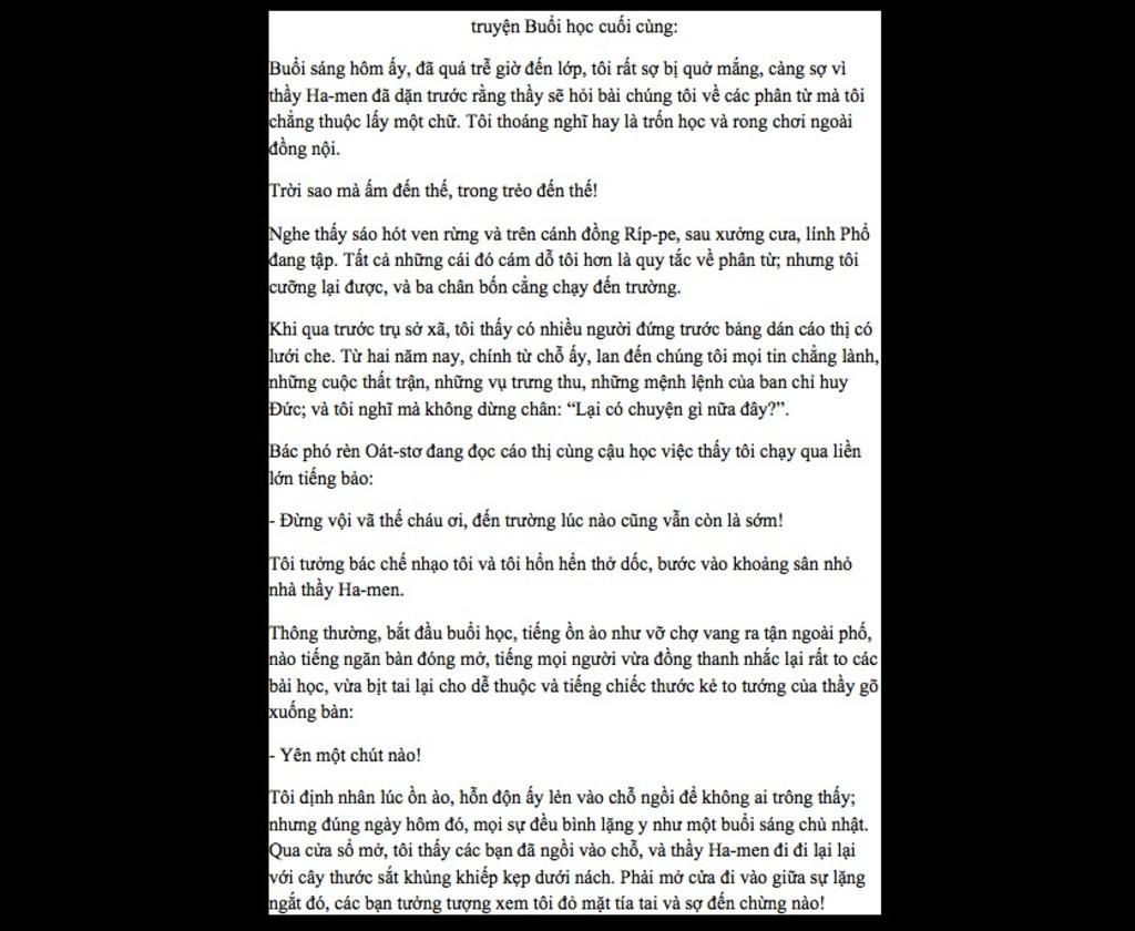 - Các con ơi, đây là lần cuối cùng thầy dạy các con. Lệnh từ Béc-lin là từ nay chỉ dạy tiếng Đức ở các trường vùng An-dát và Lo-ren… Thầy giáo mới ngày mai sẽ đến. Hôm nay là bài học Pháp văn cuối cùng của các con. Thầy mong các con hết sức chú ý.